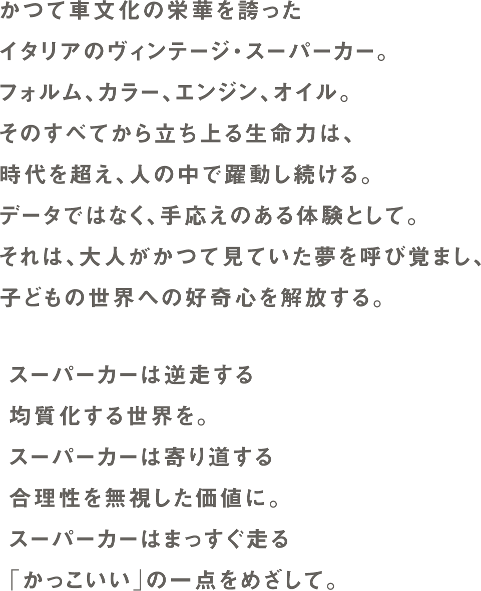 | Our Mind | 忘れないこと | 個性あふれるビンテージ・スーパーカーを生み出した デザイナーの想像力に敬意を表し、 童心を忘れることなく、つねに楽しいことを発信する。 |