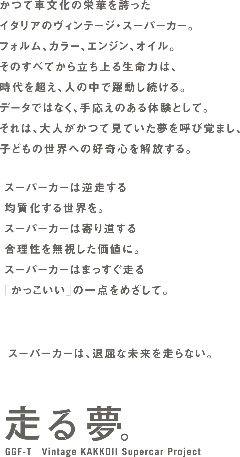 | Our Mission | 届けたいこと | 果てしない理想の追求から生まれた ビンテージ・スーパーカーを触れることで、 夢や目標をもち、それを実現することの素晴らしさを感じてもらう。 |